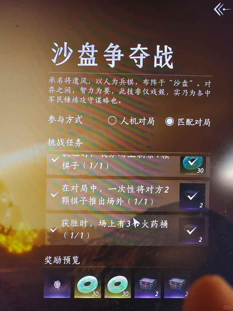 久经边关沙场的战士,勇敢与谋略缺一不可。除了在鏖战群英中以武服人外,在沙盘之上以智取胜也是一条名扬边关的路。在「沙盘争夺战」中,全面升级的嫖姚棋玩法将限时开放!除了开放匹配对战之外,还将有更多的对战乐趣与策略深度。那么沙盘争夺战怎么快速完成呢?小编为你准备了一份攻略,一起来看看吧~