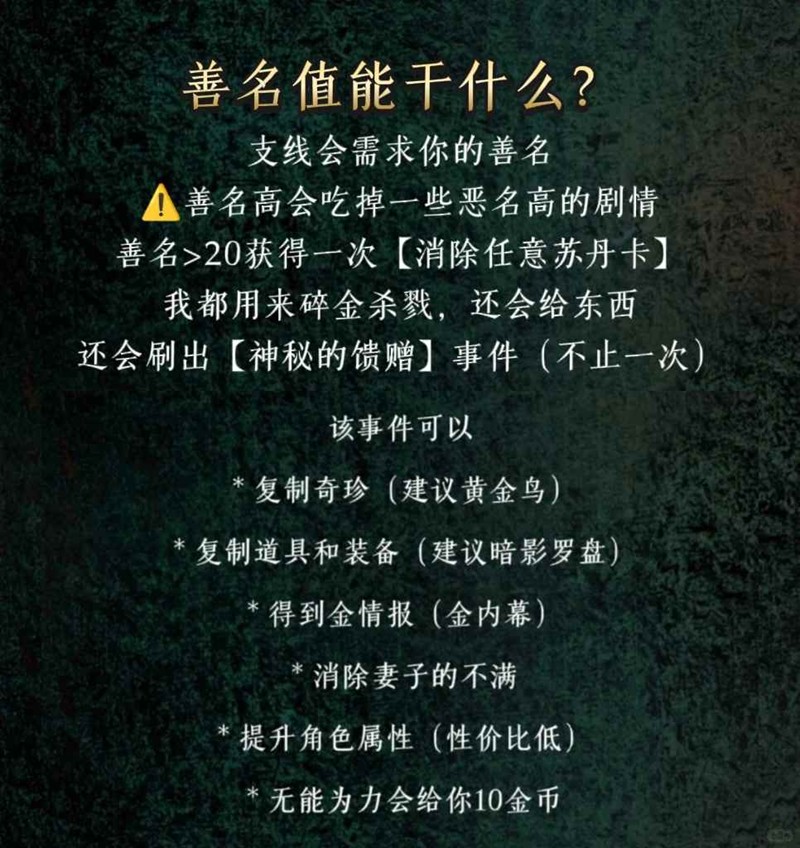 【随机事件】见P3-P5优先级侠义>善名>权势,前期可以善名>侠义。