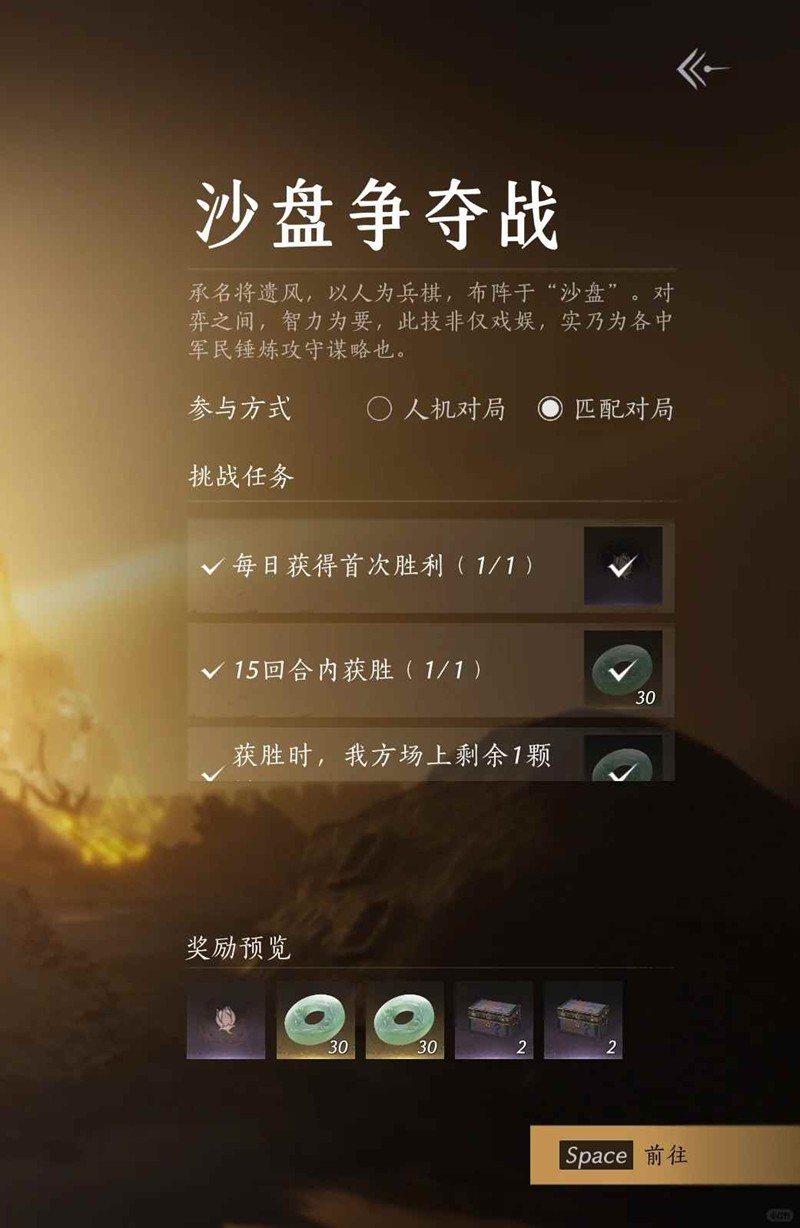 在「沙盘争夺战」中,全面升级的嫖姚棋玩法将限时开放!久经边关沙场的战士,勇敢与谋略缺一不可,在沙盘之上以智取胜也是一条名扬边关的路。那么沙盘争夺战怎么快速完成15回合获胜呢?小编为你准备了一份攻略,一起来看看吧~
