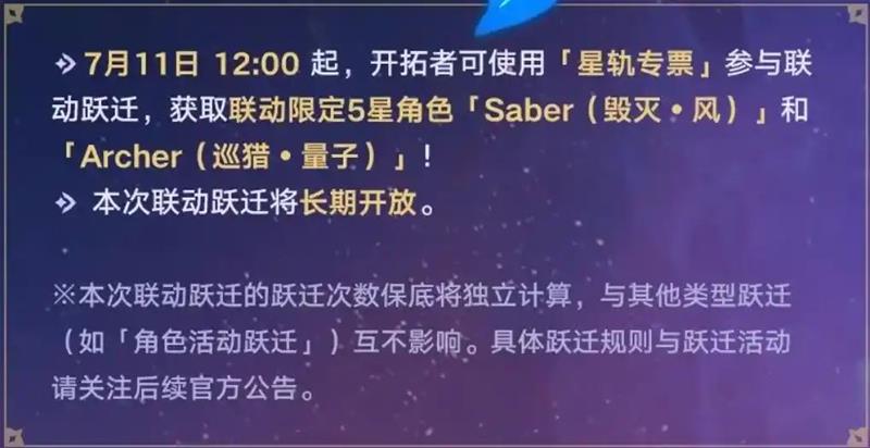 根据官方公告,本次《崩坏:星穹铁道》与Fate系列的联动卡池将于7月11日12:00正式开启。届时,开拓者可以使用「星轨专票」参与联动跃迁,获取限定的五星角色Saber(毁灭·风)和Archer(巡猎·量子)。这两个角色的加入,将为游戏的战斗体系带来更多策略性和趣味性。