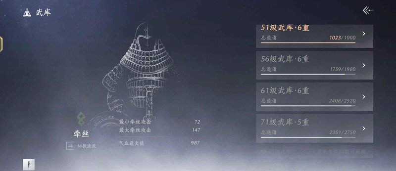 流派切换:进入武库后,务必在左侧切换至对应流派(如鸣金流选“鸣金武库”),通用流派仅作过渡。