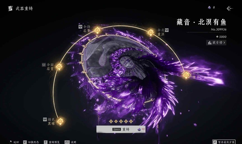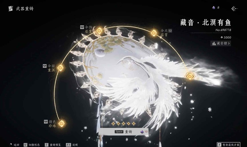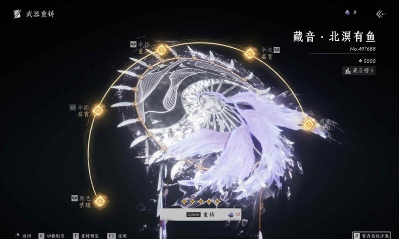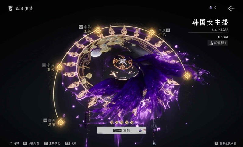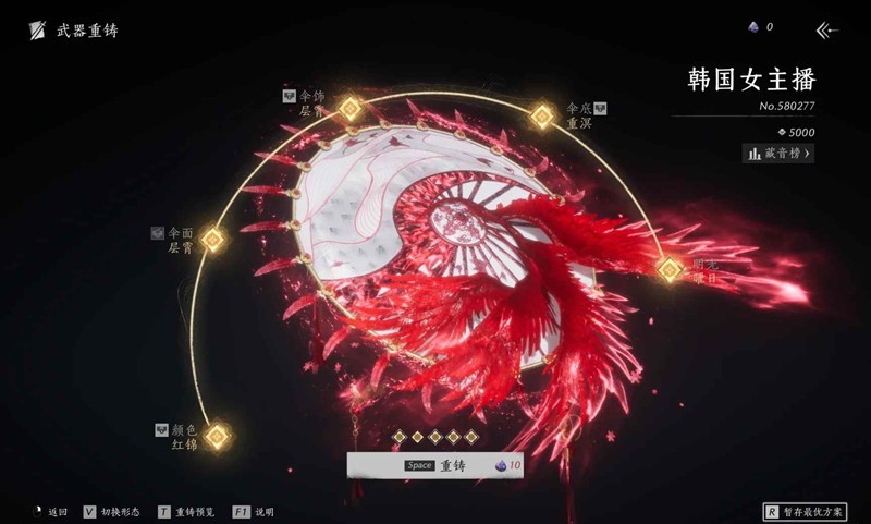 武器重铸:首先,我们应该了解自己需求什么;比如:“伞面”、“颜色”、“普通五金”……有需求之后再进行重铸武器,正常开孔保底大概120太一玄石左右、锁孔双倍太一、普通五金大概4k左右、套装看个人预算再追。开完5孔后还有没想要的颜色或者伞面,追一次600米左右。