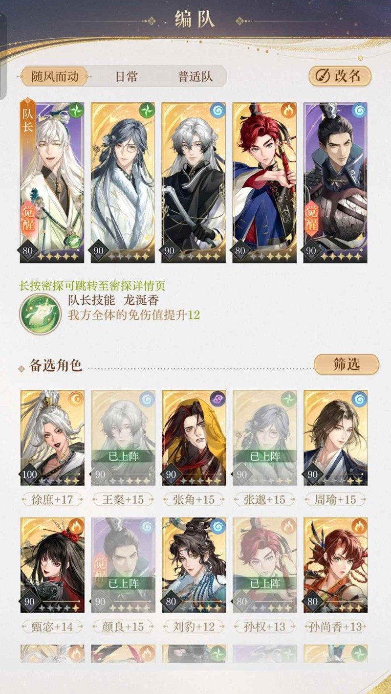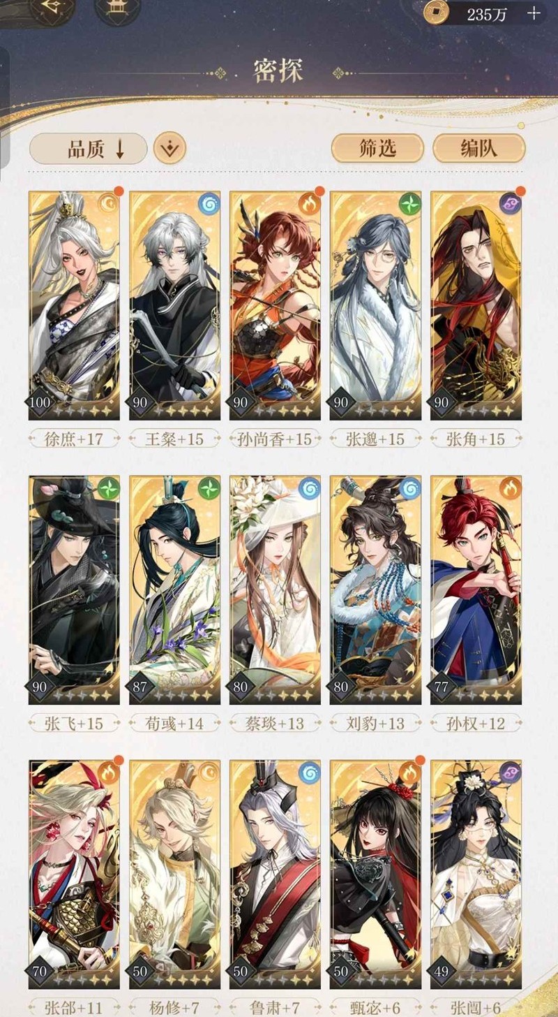 命盘:权完美盘(两金即可),王粲回血盘(对于低练还是挺重要的),颜良狮子喵正常盘,张邈两金盘