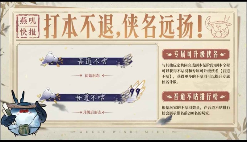 与其他玩家共同完成副本某阶段/副本全程可以获得不咕羽和专属可升级侠名【吾道不咕】,获得更多的不咕羽可以提升专属侠名计数。吾道不咕排行榜,根据玩家的不咕羽数量,在吾道不咕排行榜会展示排名前200名的玩家。