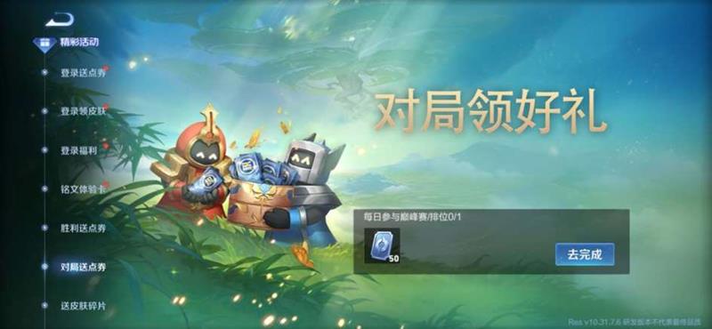 活动内容:每日参与对局1场(排位赛/巅峰赛)可前往活动界面领取点券*50