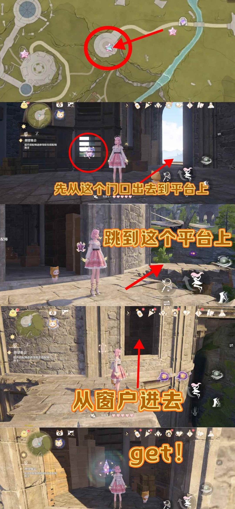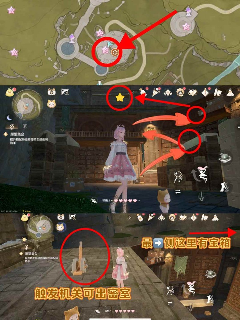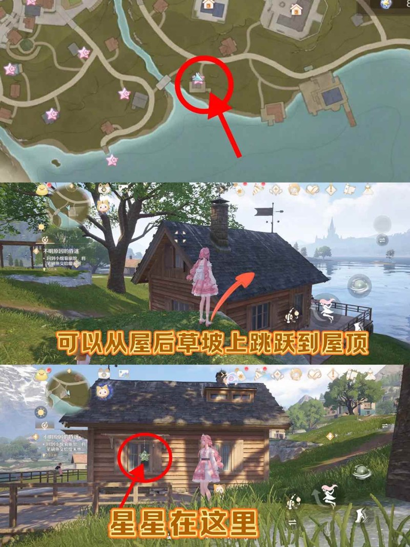 4. 根据大喵的提示星星在下层建筑中,从星星上面的圆形广场上可以看到有一个木板盖着的入口,向下跳跃砸烂入口即可进入底部房间,之后按照图片指示跳就好了(不要忘记屋子里还有一个大宝箱一定要去开!!!)