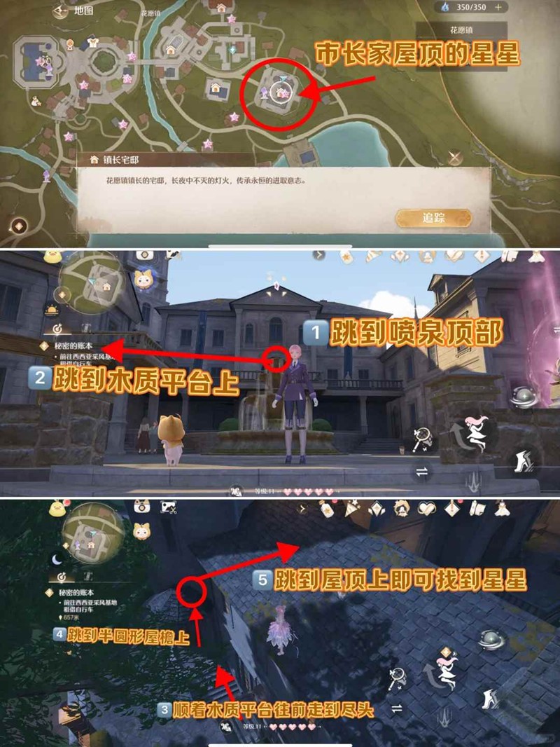 3. 【镇长家屋顶上的星星】先跳到镇长家院子里喷泉顶部,在跳到左边的木质平台上,一直向左走到尽头后跳到半圆形房顶上,在跳到斜坡屋顶上。