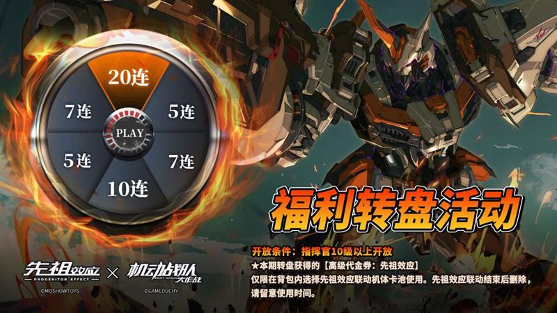 限时登录转盘活动将在联动下篇抵达后同步开启,活动期间连续登录游戏,即可参与机体转盘活动。本次转盘活动持续5日,转盘获取的【高级代金券:先祖效应】绑定先祖效应联动机体卡池,仅限活动期间使用~