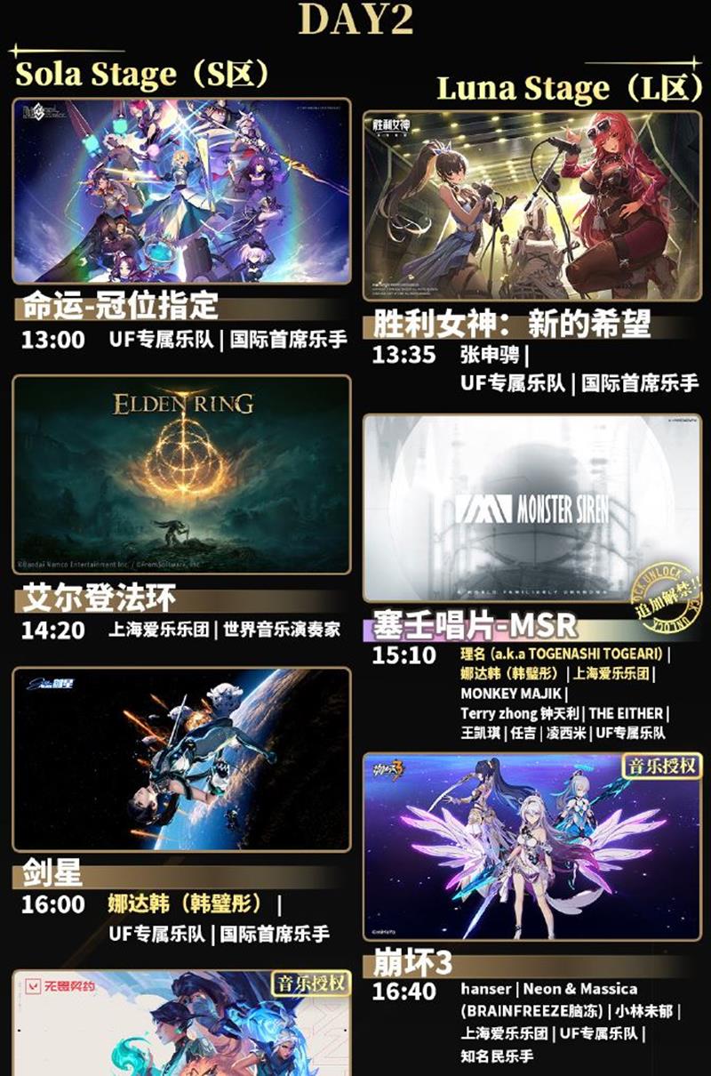 顶级游戏IP齐聚:《艾尔登法环》《无畏契约》《崩坏3》等知名IP将在UF迎来首次国内线下演出,《最终幻想系列》《女神异闻录:夜幕魅影》《英雄联盟》等热门IP也将带来国内首次演出曲目。