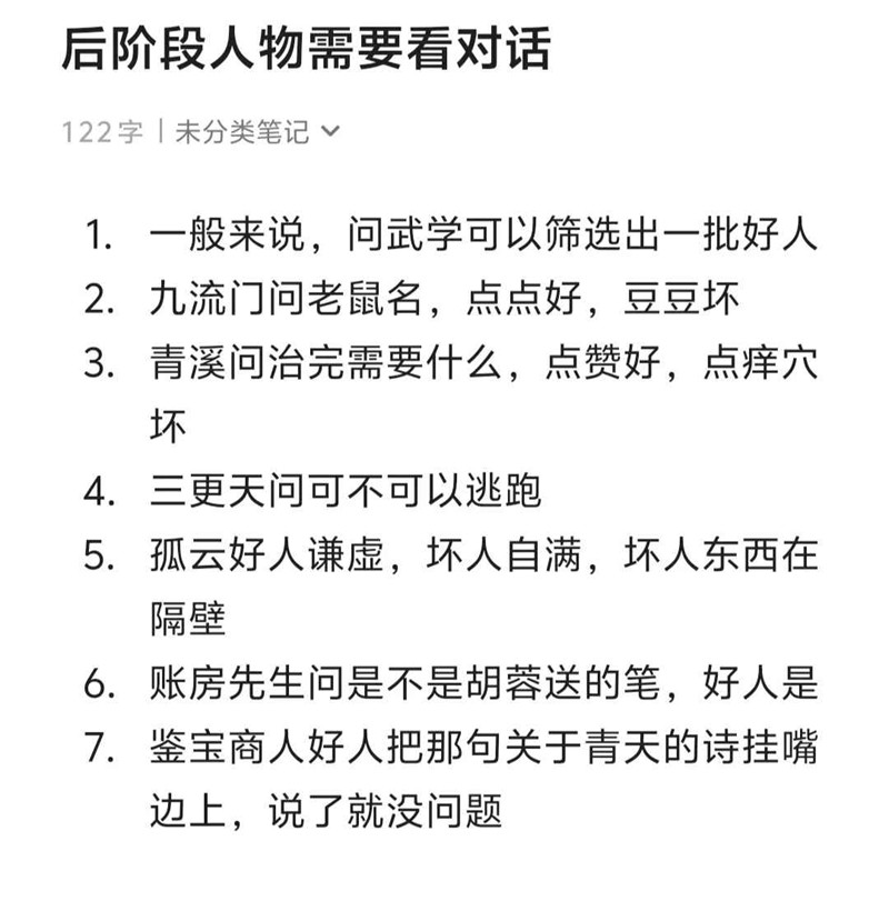有时候你会遇到一些人机,问题要尽可能细点,比如遇到青溪总是不认真回答,你就需要问一个指向性较为明显的问题,比如我需要给你什么报酬?狂澜,天泉回答含糊,就问他狂澜/天泉的武学是什么?