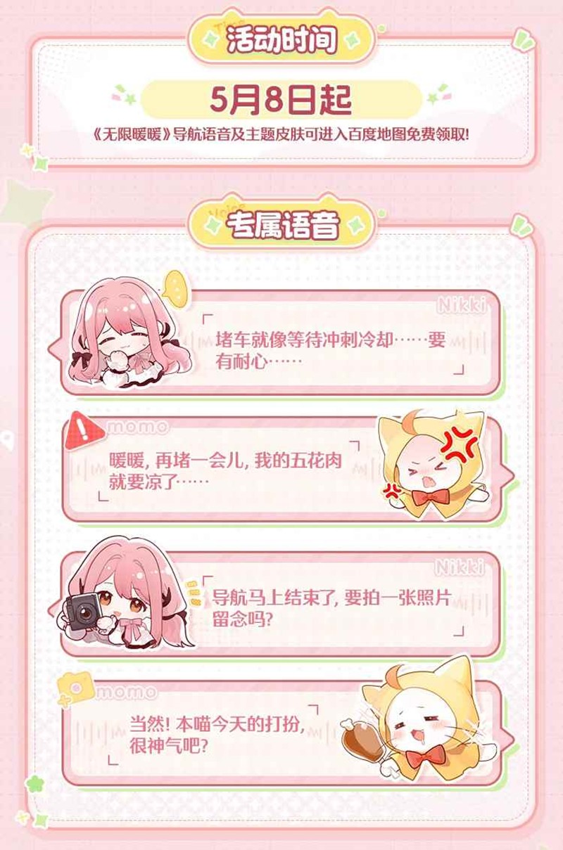 《无限暖暖》与百度地图开启联动!暖暖主题定制导航语音现已上线!“准备好了吗?要去找奇想星喽!”“导航开始啦,虽然路途有些远,但有我和大喵呢~“具体联动情况是怎样的呢?一起来和小编看看吧~
