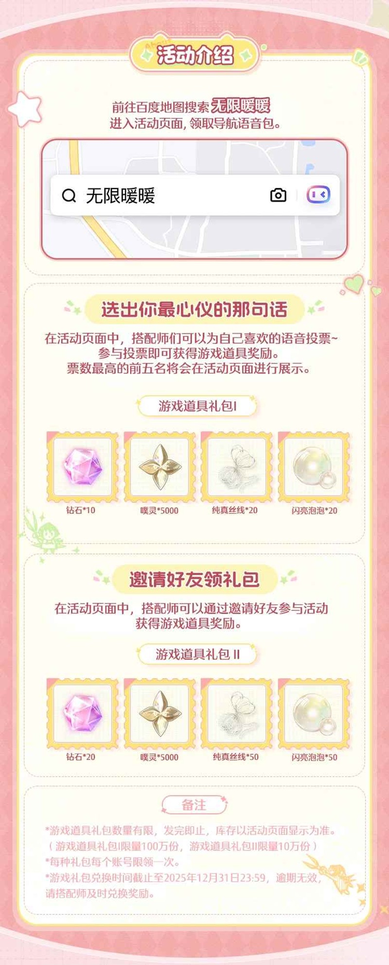 1. 投票选出你最喜欢《无限暖暖》专属语音。2. 邀请好友下载使用《无限暖暖》语音