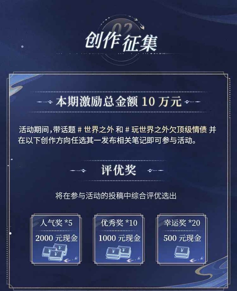 带话题 #世界之外 和 #玩世界之外欠顶级情债 围绕以上创作方向发布相关笔记。