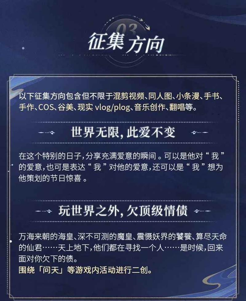 征集形式:混剪视频、同人图、小条漫、手书、手作、COS、谷美、现实vlog/plog、音乐创作、翻唱等。