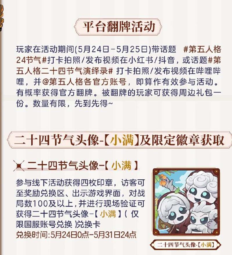 线上参与:在活动期间,通过微博、小红书、抖音或哔哩哔哩发布带有特定话题的打卡照片或视频,并 第五人格官方账号。