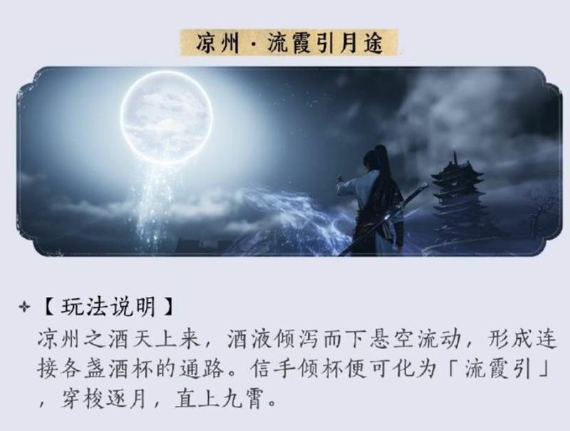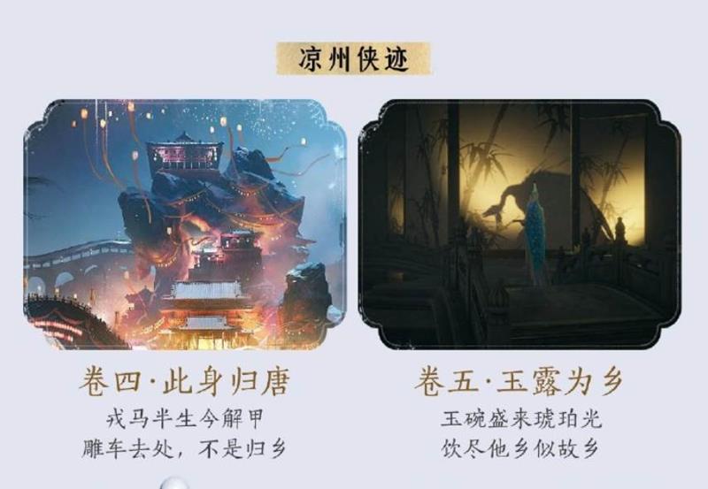凉州是河西篇章的重要组成部分,以其独特的边塞风光和浪漫风情著称。玩家在完成河西镇守「白头城」后,即可接取河西残章「十骑出关」,正式开启凉州地区的探索。凉州的视觉核心灵感来源于“葡萄美酒夜光杯”,由酒液和玉石组成的瑰丽奇观将成为地图的主要特色。