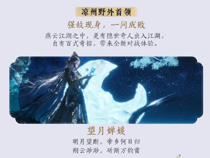 开放首个区域强敌“朔风守卫”,玩家需团队协作破解其“风蚀”状态下的范围伤害技能。此外,全新的野外BOSS「望月婵媛」也将在凉州篇章的第一次更新中率先开放。