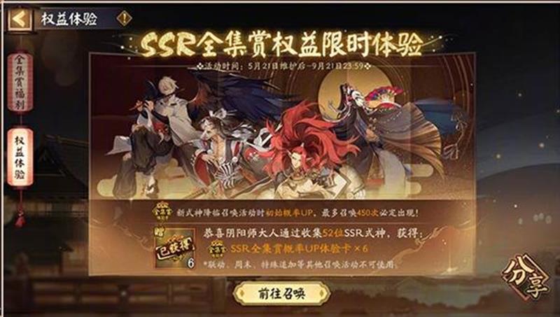5月21日至9月21日,未达成全集赏的玩家可领取“SSR全集赏体验卡”,最多使用6次。体验卡生效期间,新式神召唤的保底次数从800次降至450次。根据当前图鉴缺失数量(3个以内/4-6个/6个以上),玩家可分别享受6次/5次/4次概率提升福利。