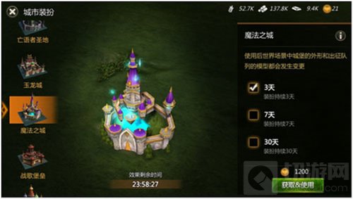 在《列王时代》当前版本中,游戏共有“亡语者圣地”、“玉龙城”、“魔法之城”、“战歌堡垒”、“彩虹之城”5种城市装扮供玩家选择,而在之后的版本中,或将有更多城堡外装加入《列王时代》的大陆中,各位领主大人敬请期待!