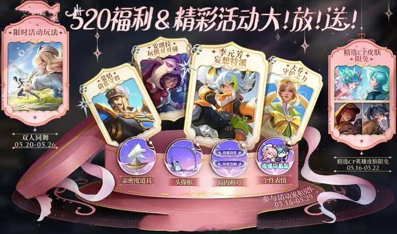 王者荣耀已经连续三年在520的时候上架新皮肤,还有相关活动了,所以今年也不例外。首先,我们来看看此次520的相关福利活动,其实跟去年是没有多大区别的。目前,王者荣耀官方已经确定开启双人同舞的模式,这个娱乐模式可是考验情侣玩家的默契程度啊,毕竟两个玩家操控一个英雄,还是有点难度,一不小心就可能要分手啊,哈哈。另外呢,王者荣耀永久皮肤自选宝箱上线,玩家完成任务,就可以领取活动专属皮肤哦,不知道今年会上架哪些勇者皮肤。