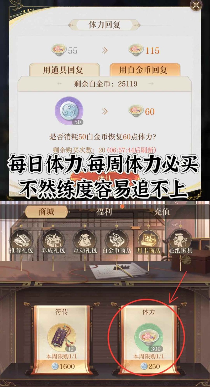1、每天用100白金币买2次体力(50白金币一次),每周250白金币买商店体力。