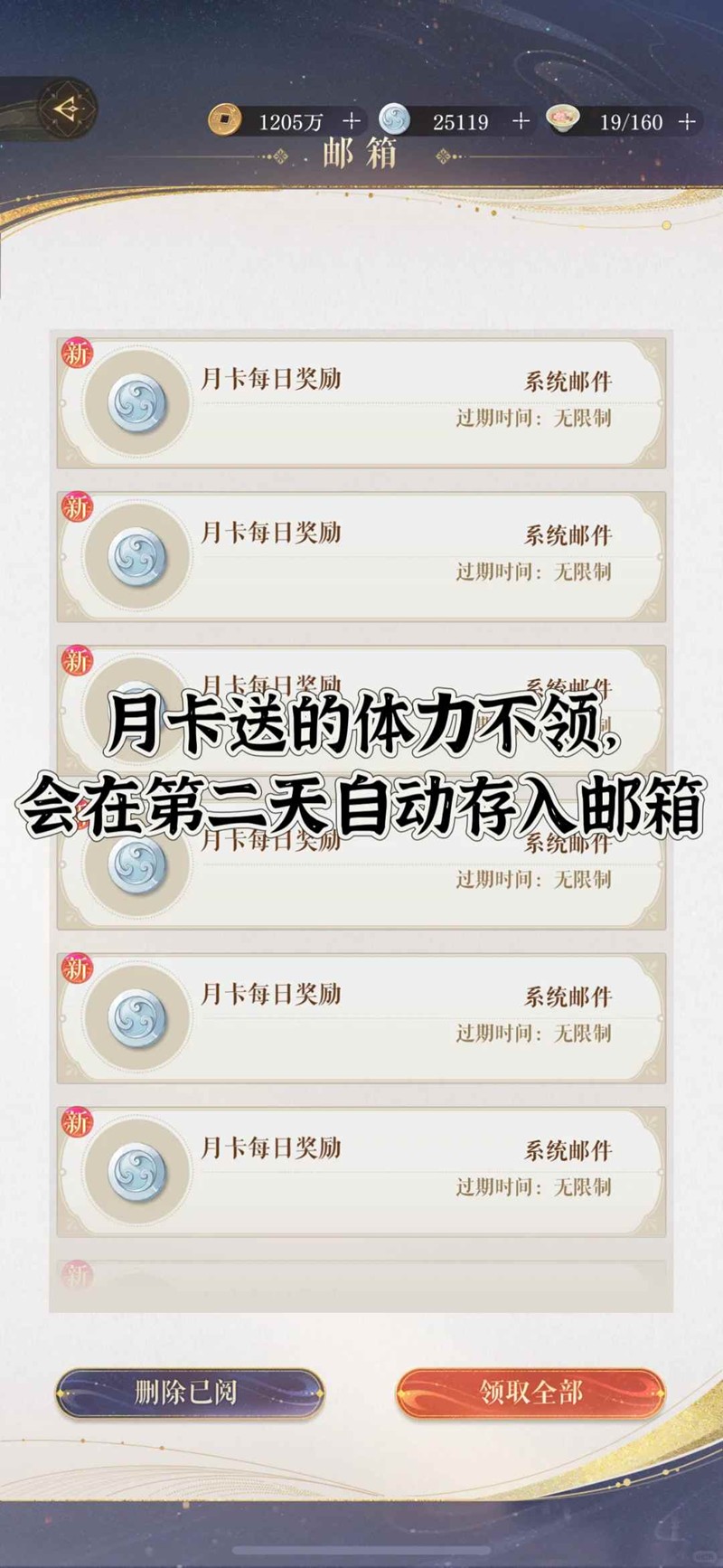 1、月卡送的每日体力不领,直接囤邮箱(但用白金币买体力还是要买);