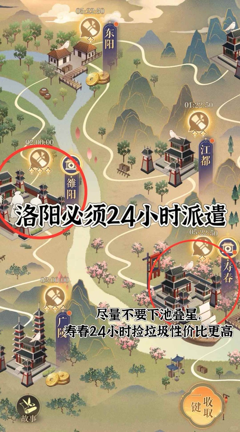 1、每日派遣改为洛阳、寿春都24小时派遣,尽早给新密探捡到二星(大部分密探都是二星完全体,但下池叠星无定轨,很容易捞到倾家荡产,下一个新池就没资源了,然后要么瑕图鉴要么硬着头皮氪,所以微氪不建议下池赌);