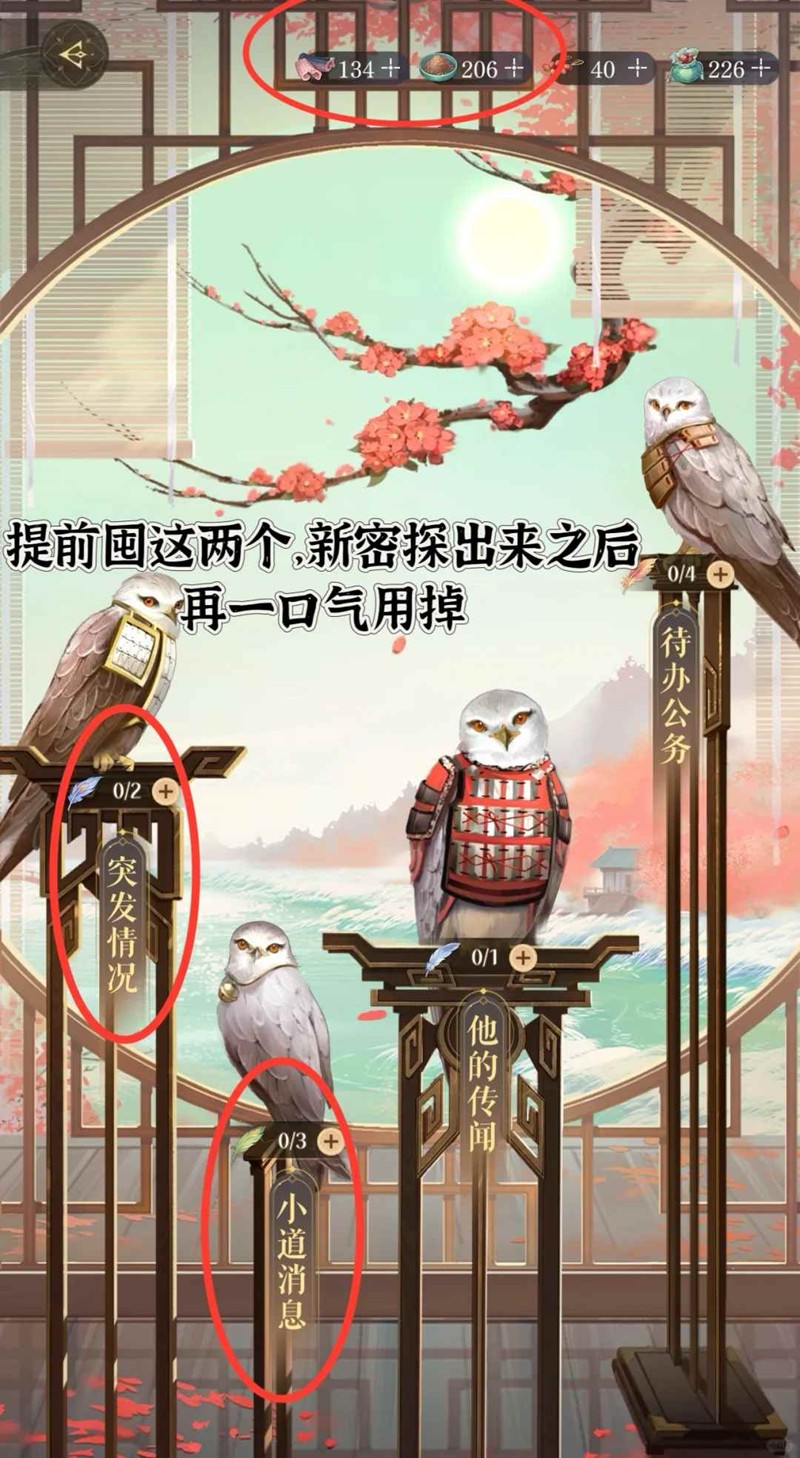 1、囤蛇肉和麻籽,方便新密探上线后立刻刷到他们的好感度礼物和小道消息,有利于给有必要的密探尽早开双命盘和集齐传闻给的密探碎片,加速升二星;