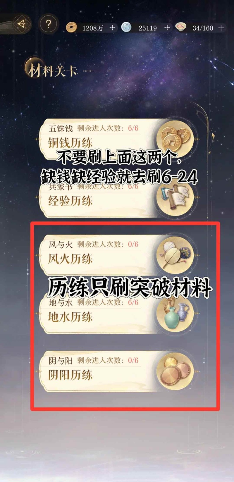 剩余体力:等级突破材料>历练修为材料>6-24