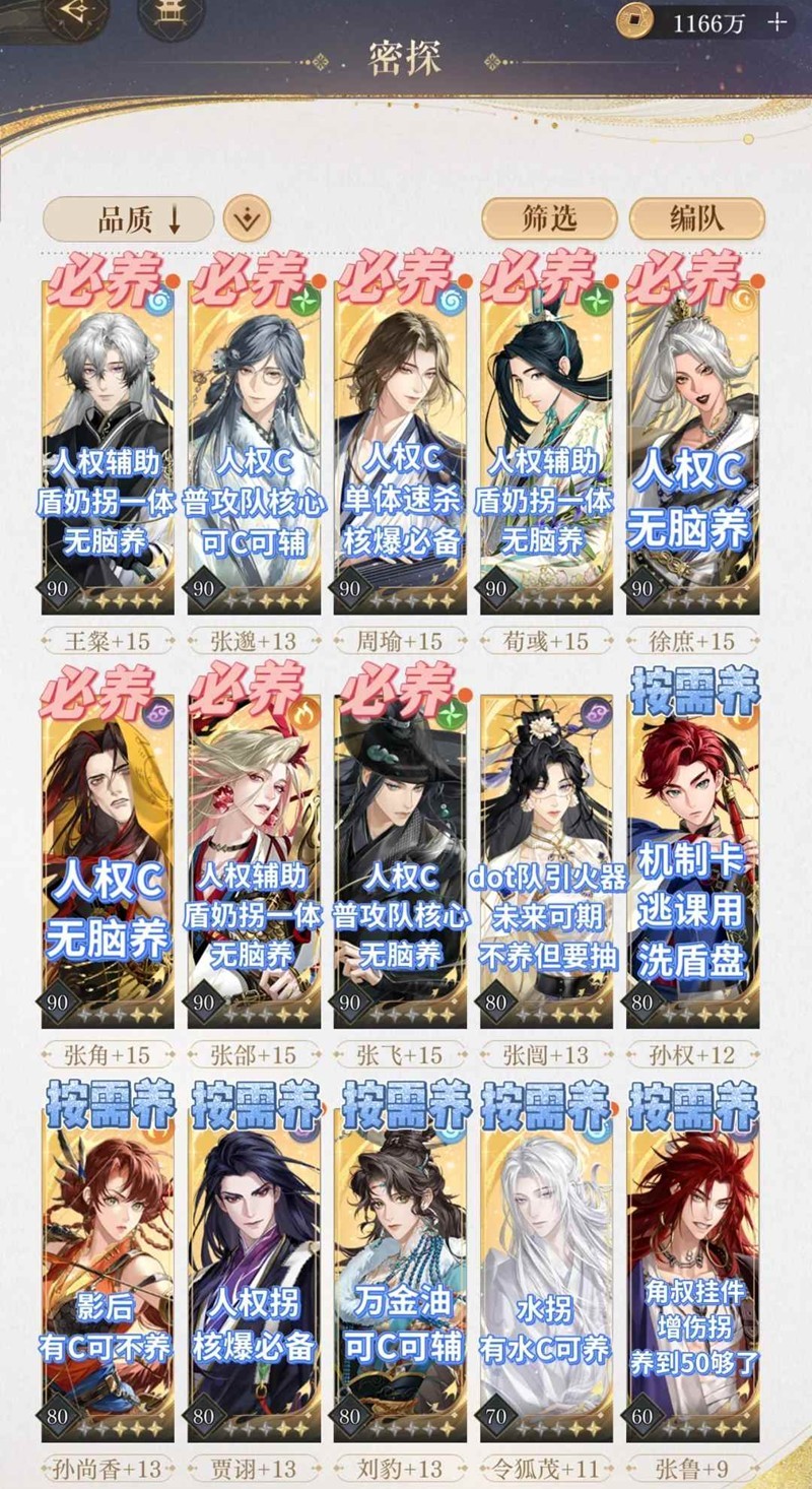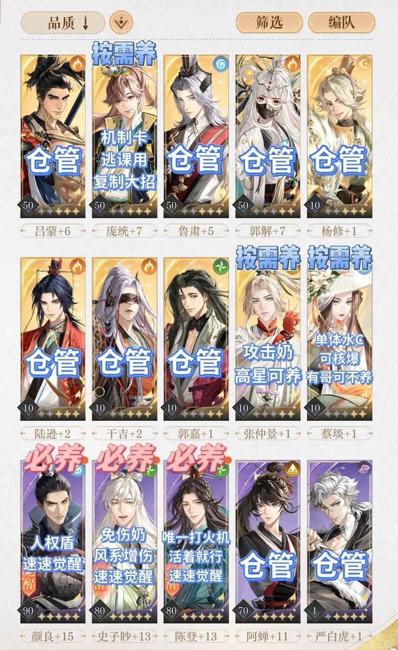 3. 按需养的卡:确定有队友/卡关再养,练度活着就行(常用的养到70,其他的站不住再升)