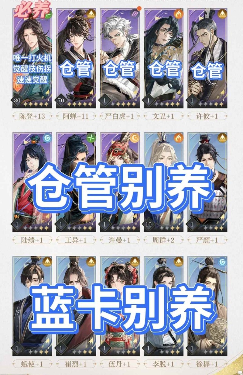 新手有啥用啥,实在抽不到卡用仓管过渡也行,但蓝卡不要养,紫卡别乱养。