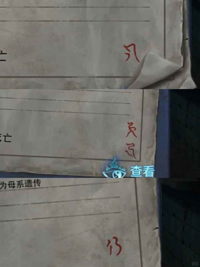 根据闹钟的时间,填写桌上的公告,让收时间为“11:42”。出去,将申请表放到薛护士前面的盒子里,解锁探望室。到走廊里,用剪刀剪下娃娃身上的鱼线。进入探望室后,查看桌上的病历,得到符号。