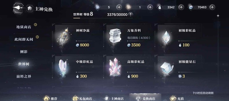 世界树商店7级之前,只买新的藏品,等级用彩虹晶和神树净露堆,商店7级时要保证所有蓝/白藏品全部购买完毕,准备开始购买紫色藏品。