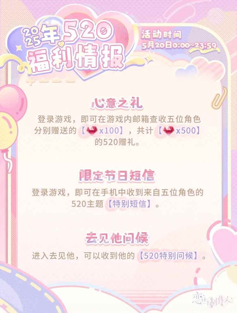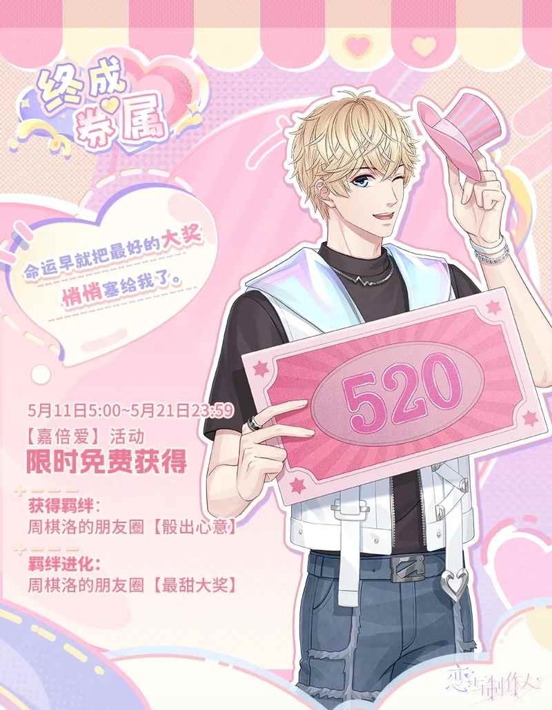 《恋与制作人》是芜湖叠纸网络科技有限公司开发的一款面向年轻女性用户的以恋爱为主题的角色扮演游戏。游戏基于抽卡养成的玩法开展。玩家以女主角的身份负责经营一家影视制作公司,历经各种离奇事件,邂逅四个不同类型的男主角,并与他们培养感情。那么恋与制作人520有什么活动呢?一起来看看吧~