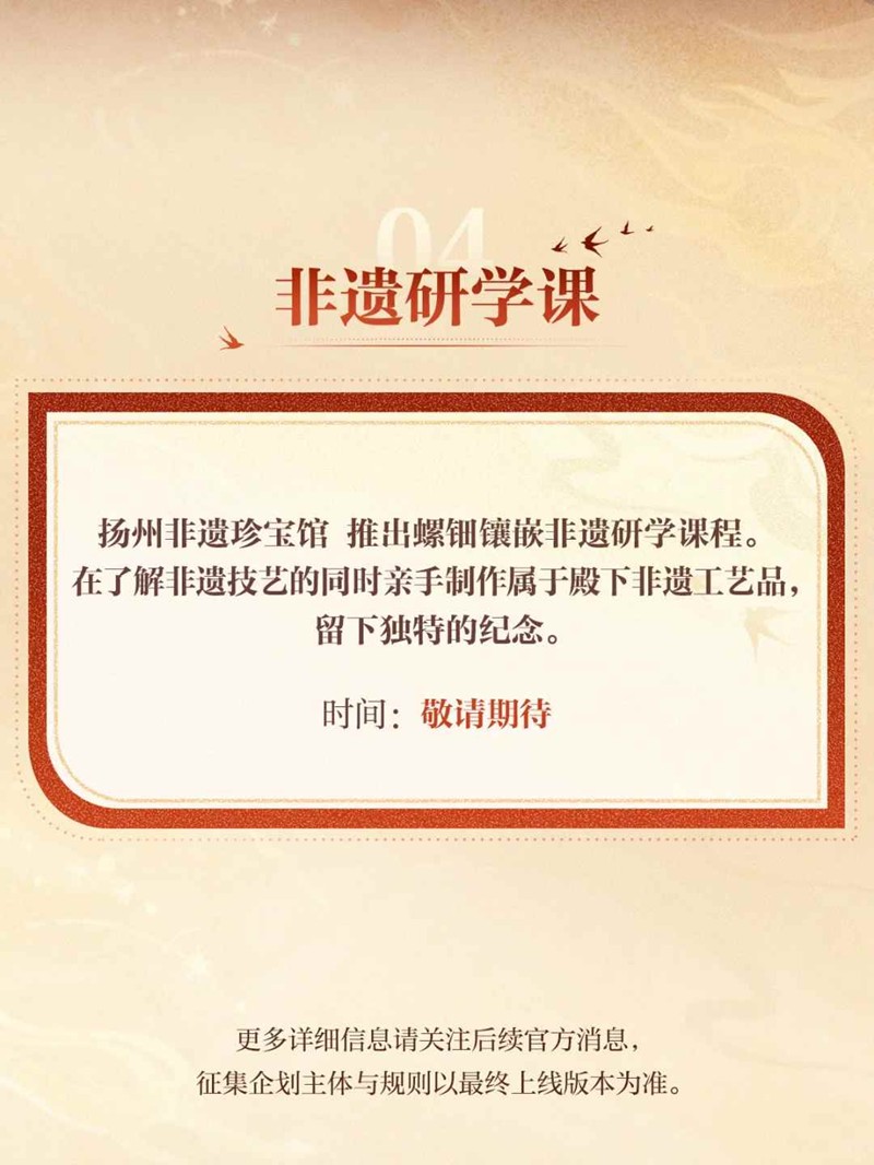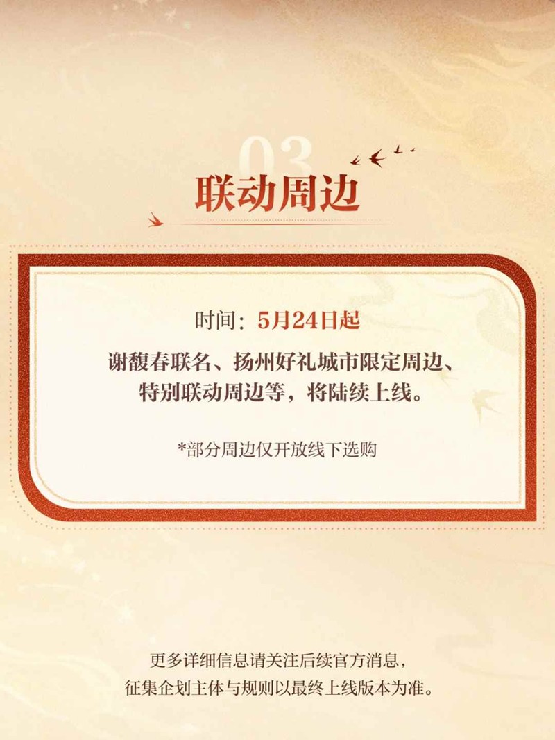 如鸢携手 @扬州文旅 @扬州运河文化投资集团 @谢馥春 @扬州非遗珍宝馆 @江苏扬州瘦西湖 以及个园、何园、扬州好礼等文旅品牌,共同开展为期一个月的扬州x如鸢“汉韵游扬州”城市联动企划暨国际汉文化大秀,诚邀殿下莅临体验!