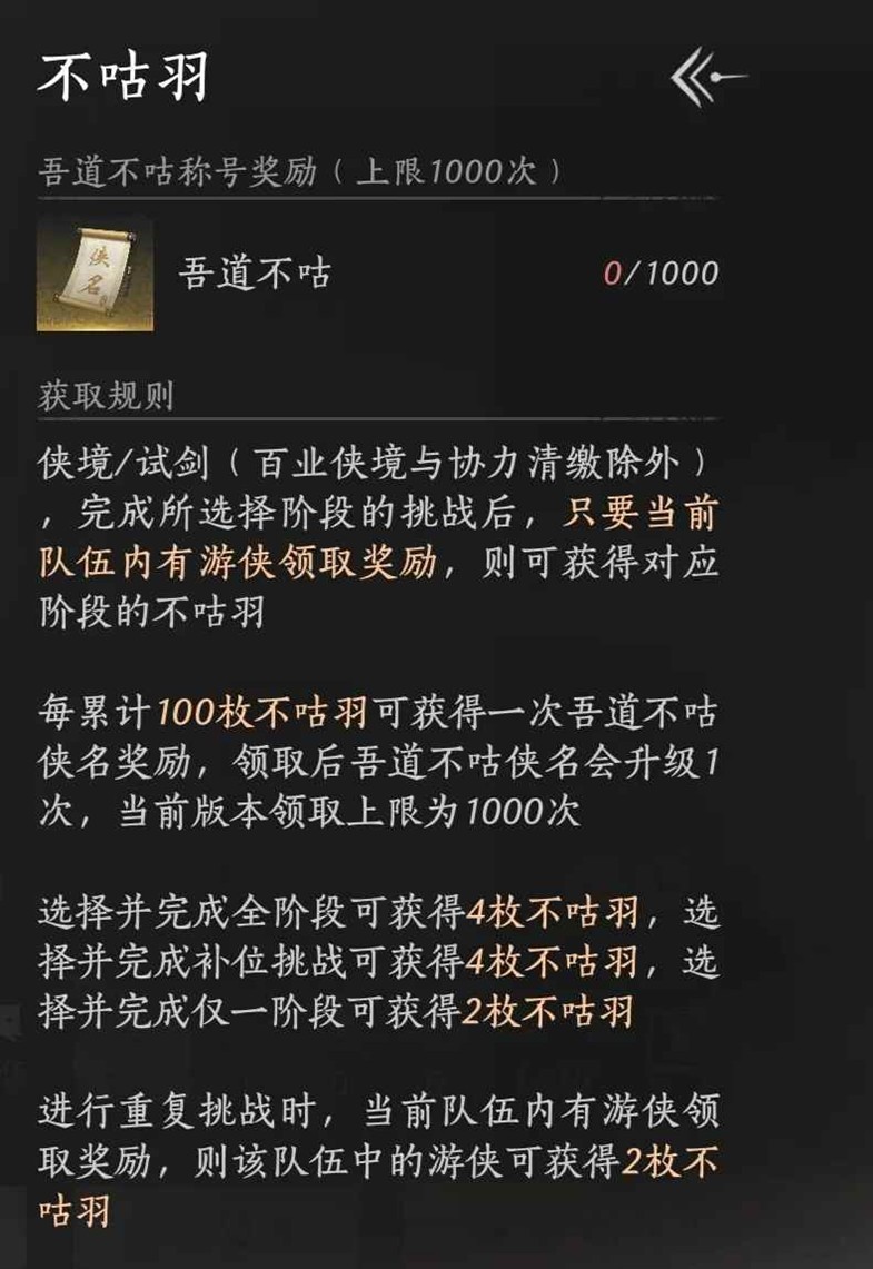 燕云十六声新出了一个非常精美的称号“吾道不咕”,打副本时有人领取奖励可获得2跟羽毛,打完全阶段和匹配补位都是4根,重复挑战只有2根。100个羽毛可领取一次称号,称号可以升级999次,10000个羽毛升到满级,升级后的不咕会有翅膀和数字显示。那么怎么快速获得这个称号呢?小编为你准备了一份攻略,一起来看看吧~