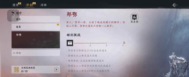 燕云十六声有试炼玩法,玩家可以自行选择挑战不同难度的野外首领获得丰厚奖励。清河、开封、河西三个地图都有野外首领可以挑战,挑战完成一定数量可以获得相应boss的精美头像,以及一些提升战力的材料和一些金装装备。那么野外首领郑鄂应该怎么打呢?小编为你准备了一份简单攻略,一起来看看吧~