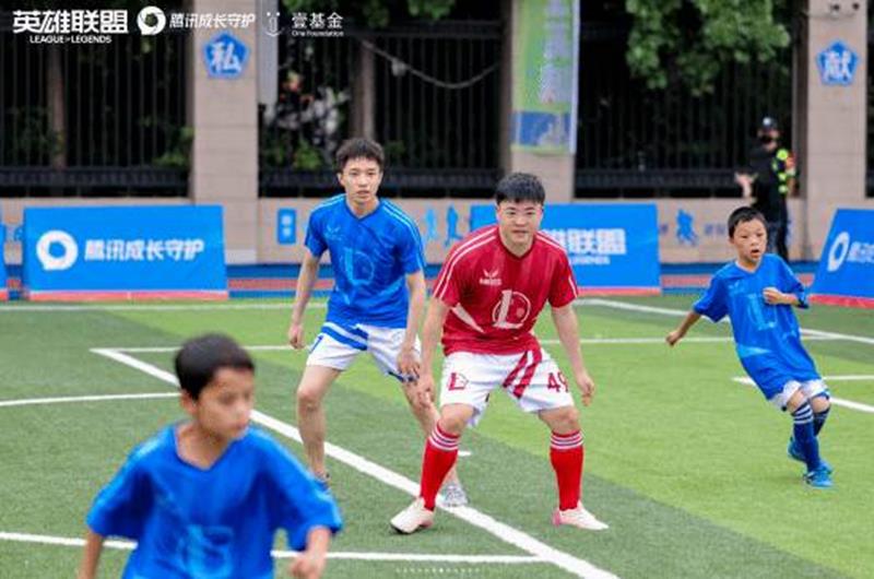 活动中,Uzi和明凯分别身穿红蓝两色球衣,各自带领由学生们组成的红蓝两支队伍,展开了一场别开生面的“英雄足球赛”。比赛引入了《英雄联盟》的英雄技能、增益等概念,将游戏中的战术思维融入现实体育竞技,极大地提高了孩子们参与体育运动的积极性。
