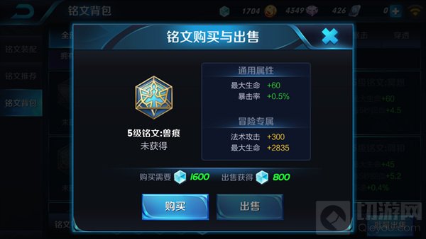 然后是蓝色5级铭文兽痕,兽痕的属性是暴击率+0.5%,最大生命+60,蓝色种类的铭文不考虑太多,因为5级铭文中只有兽痕附带暴击率。