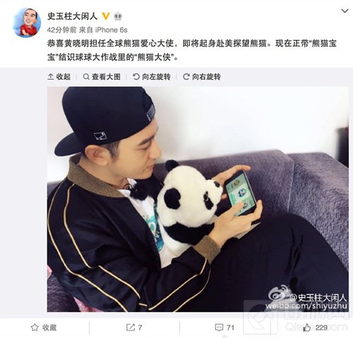 今日,史玉柱发布微博,透露著名影星黄晓明也在玩《球球大作战》的消息。史玉柱爆料称:“(黄晓明)现在正带熊猫宝宝结识球球大作战里的熊猫大侠”。