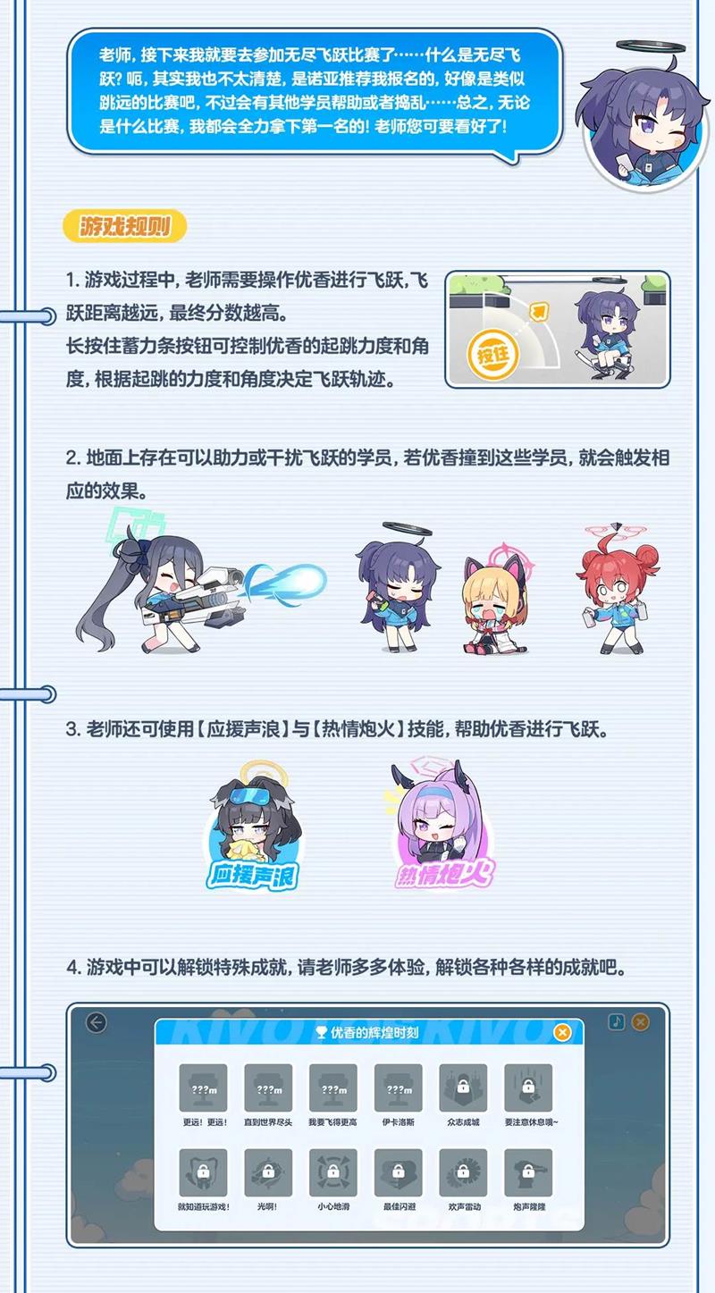 为了增加游戏乐趣,活动设置了多个特殊成就供老师们挑战。同时游戏还提供了两个实用技能:"应援声浪"和"热情炮火",合理使用这些技能可以帮助优香飞得更远。需要注意的是,每日首次完成游戏才能获得奖励,每位老师每天只能领取一次奖励。