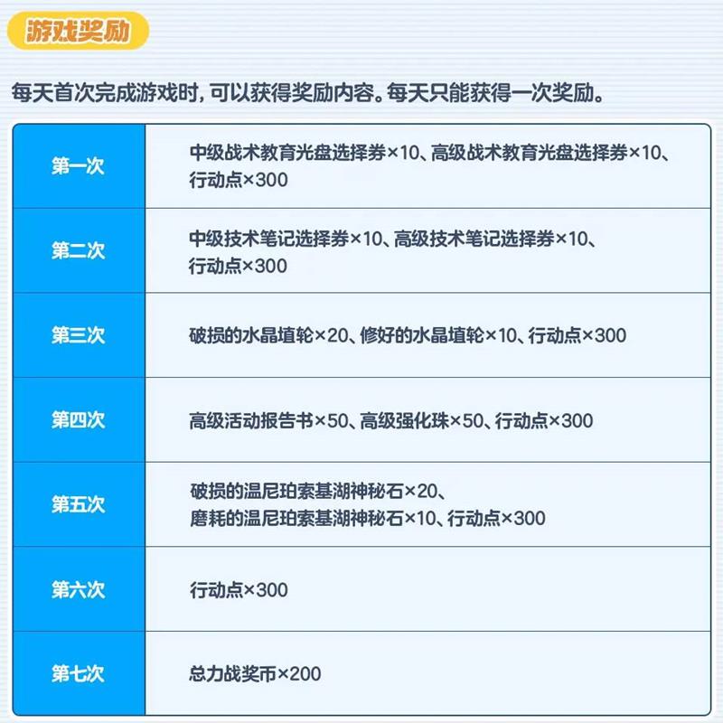 奖励内容分为四个档次依次解锁。第一天的奖励是500瓶运动饮料,第二天可以获得1至3点的骰子确定券各一张,第三天则是4至6点的骰子确定券,最后一天能领取600个青辉石。所有奖励领取完毕后,活动将不再提供额外奖励。