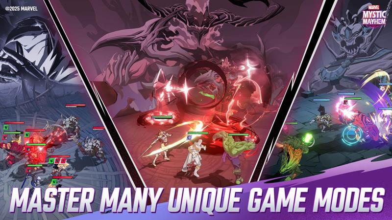 《漫威:秘法狂潮》以噩梦为主题,玩家将与奇异博士、钢铁侠、蜘蛛侠等超级英雄并肩作战,对抗“梦魇”的邪恶力量。游戏的核心玩法是通过卡牌驱动的半即时制对战,玩家需要策略性地构建队伍,选择射手、支援者、防御者与战士等不同风格的角色。此外,游戏还首次开放了反派阵营,包括奥创、屠杀等,降低了培养成本。