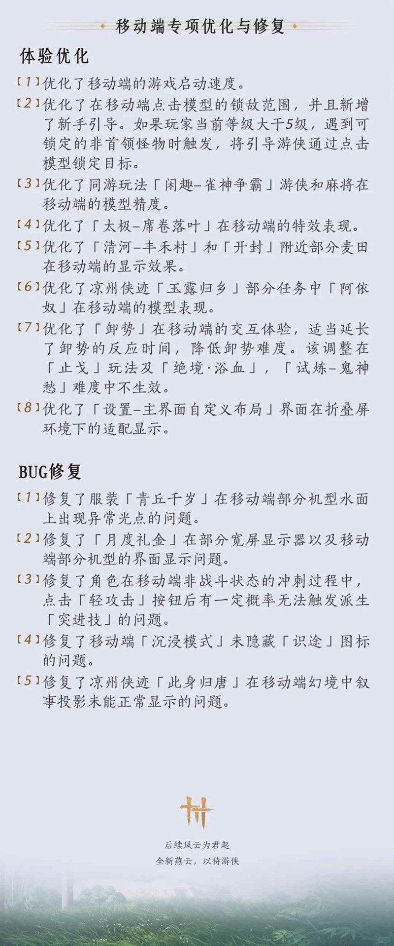 以上就是燕云十六声快报陆续实装及移动端专项优化前瞻的全部内容了,更多游戏资讯,攻略内容敬请关注切游网,您的支持是我们努力的动力!