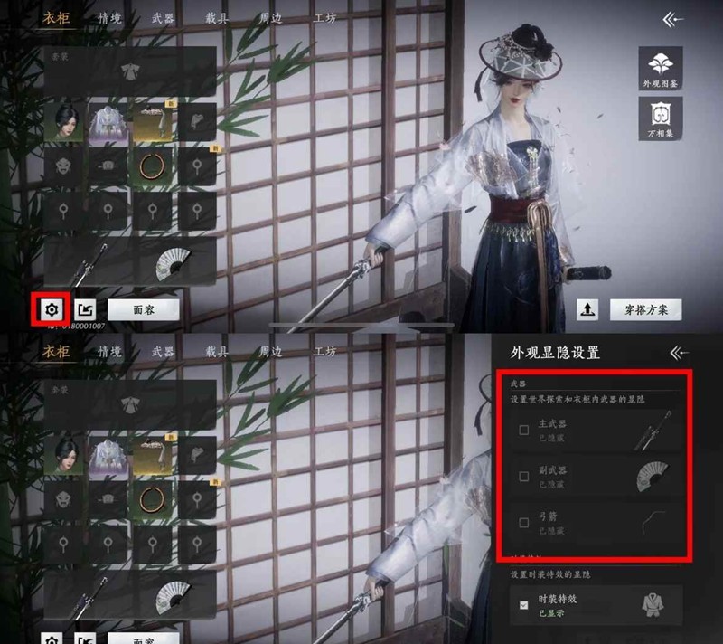 5. 想要隐藏武器和弓箭:外观左下角!移动端是设置图标 pc端就直接六个字“外观显隐设置” 点进去取消就好了