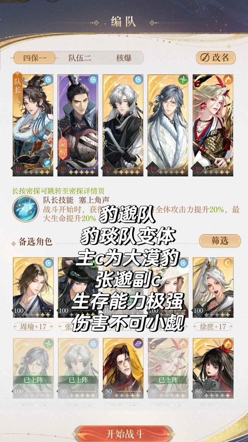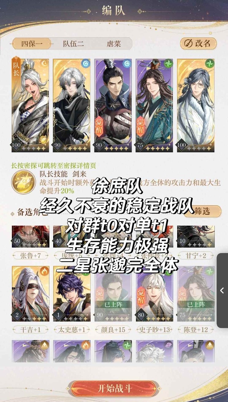 目前小鸟的配队分对群和对单,长线和短线。小鸟对群较少,主要就是徐庶和张角,他们的配队也属于最经典的配队。对单分长线短线有不同思路,但基本都围绕着技能伤害(水队)和普攻伤害(普攻队)进行,图中说了配队。真正玩的时候要看自己到底是伤害不足还是站不住,灵活调整配队。
