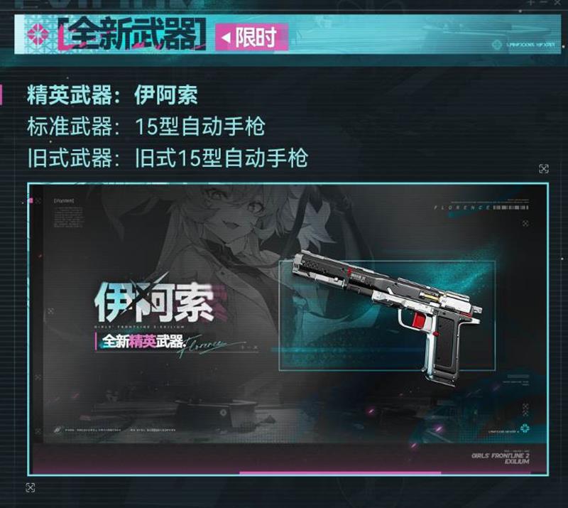 精英人形与武器:精英人形「芙洛伦」和精英武器「伊阿索」将正式上线。芙洛伦的全新外观<衣装·奇妙山药饼>也将限时折扣上架。