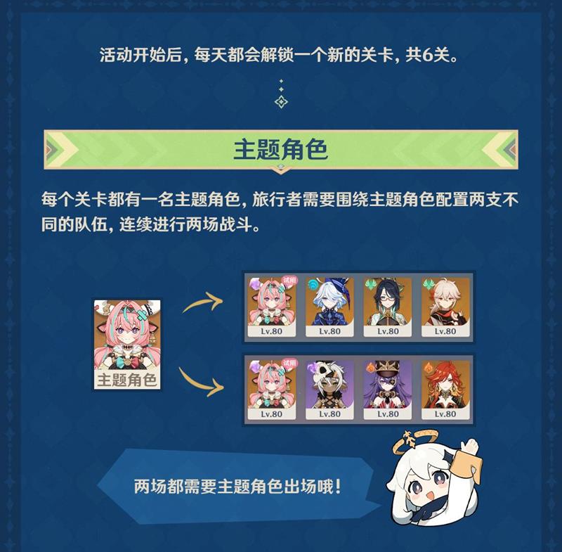 每个关卡都有一名主题角色,旅行者需要围绕主题角色配置两支不同的队伍,连续进行两场战斗。两场都需要主题角色出场。