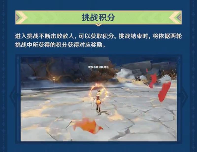 每场挑战的上下半场,均有对应的推荐元素类型。当队伍中的角色全部为推荐元素类型时,击败敌人时获得的积分将额外提高。