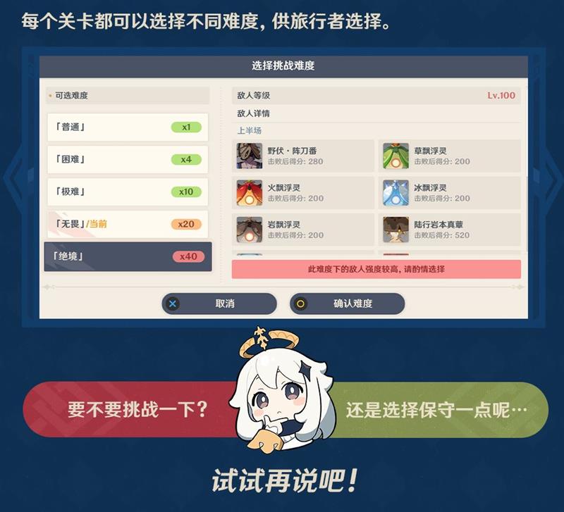 每个关卡可以选择不同难度,供旅行者选择。可选难度有普通、困难、极限、绝境等,难度越高,敌人等级越高,击败后得分也越高。进入挑战不断击败敌人,可以获取积分。挑战结束时,将依据两轮挑战中所获得的积分获得对应奖励。